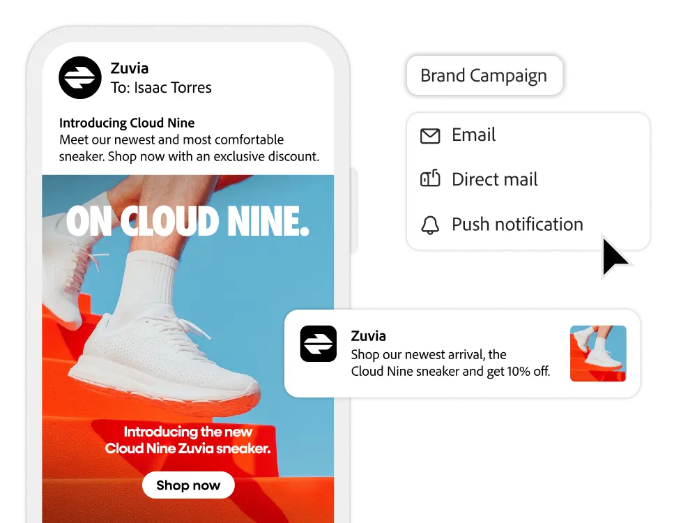 - 멀티채널 조율. 직관적인 하나의 캠페인 캔버스에서 이메일, 모바일 푸시, 다이렉트 메일 등 모든 메시지를 조율하여 일관성을 유지하세요.