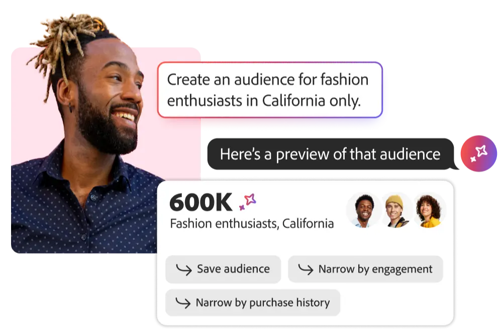 자연어 프롬프트를 사용하여 스마트 오디언스를 신속하게 생성, 관리, 최적화하세요. 보다 쉽고 효율적으로 작업하고 출시 속도를 높일 수 있습니다.
